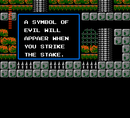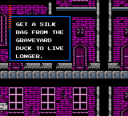 ![]() That dialogue window has two sentences: "Get a silk bag from the graveyard." "Duck to live longer." It is a fact that in Simon's Quest, you get the silk bag from a graveyard. Moreover, it is the town due left from the town that dialogue is from. As for what it means to "duck to live longer", many mysteries in that game are beaten by ducking while holding a crystal. This is the only way to progress at a cliff, for instance. While "duck to make further progress" might be more literal, "living longer" could be considered to be an abstract metaphor for "making progress." We might be justified in having some skepticism in that interpretation, since, if that is indeed intended to be a clue for the ducking mystery, it is very oblique. But EVERY clue in Simon's Quest is oblique at best. The other objection to my interpretation is that there is no punctuation separating the two sentences from each other (though there is a line break). However, it is not as though Simon's Quest is otherwise free of grammatical errors...